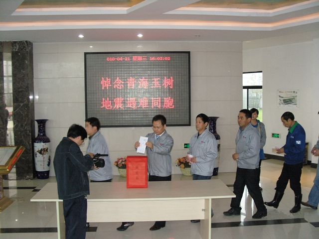 2010年4月14日青海玉樹發(fā)生里氏7.1級地震,災(zāi)區(qū)的信息牽動著公司每個員工的心,公司員工陸續(xù)通過各種方式向地震災(zāi)區(qū)表達(dá)自己的一份心意。4月21日舉國哀悼,下午4:00,公司組織員工對青海玉樹的同胞們進(jìn)行捐款,捐款前公司員工對地震中的遇難者進(jìn)行默哀。共有326人參與本次活動,所得善款共計15885元,善款將通過銅陵市紅十字會送達(dá)災(zāi)區(qū)。