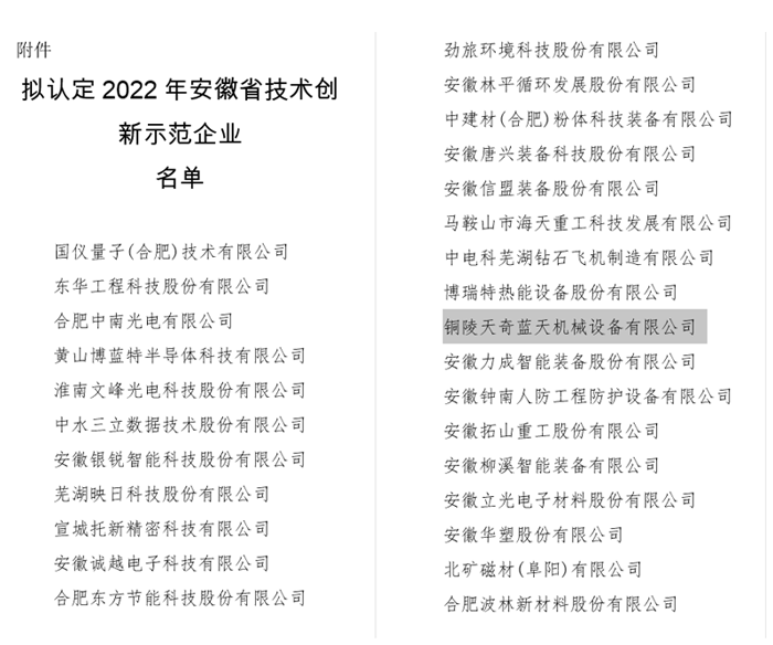 據(jù)悉:在日前安徽省經(jīng)濟和信息化廳公示的“關(guān)于2022年安徽省技術(shù)創(chuàng)新示范企業(yè)擬認(rèn)定名單”中,銅陵天奇藍(lán)天名列其中。此次榮獲該榮譽,是對公司前期技術(shù)創(chuàng)新工作的肯定和褒獎。同時也將激勵我們緊盯行業(yè)前沿技術(shù),不斷加大團隊建設(shè)和資金投入以提升公司的核心競爭力及市場影響力。促進持續(xù)發(fā)展,推動科學(xué)技術(shù)進步,力爭我司在技術(shù)創(chuàng)新領(lǐng)域取得更大成果。